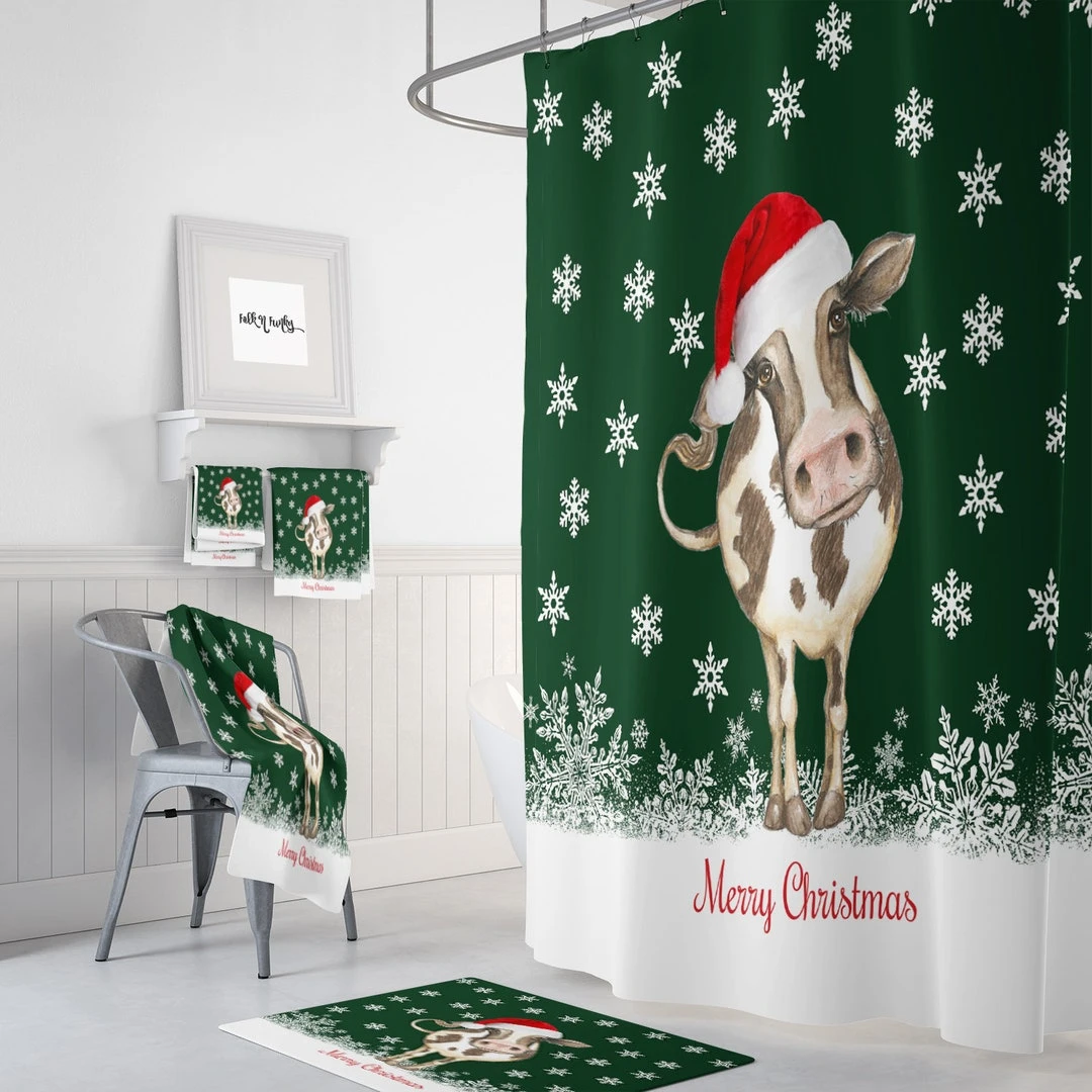 Christmas Cow Bathroom Set, Shower Curtain, Bath Mat, Bath Towels, Hand Towels – Bluefink