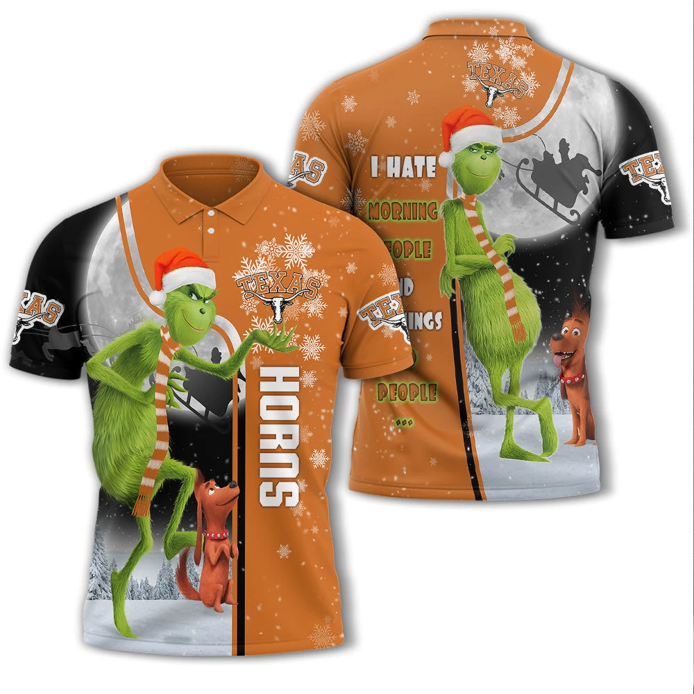 Personalized Funny Christmas The Grinch Texas Longhorns NCAA I Hate Morning People Shirt Gifts Unisex 3D Polo – Bluefink