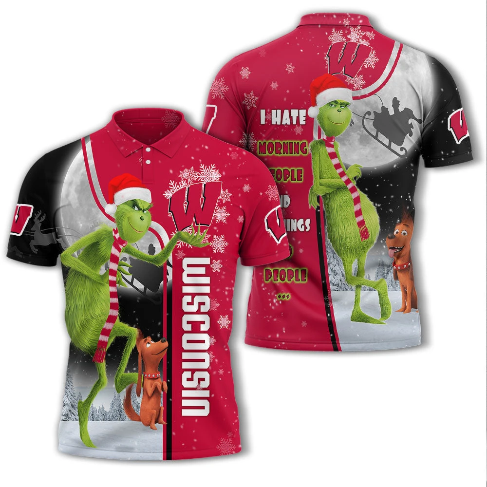 Personalized Funny Christmas The Grinch Wisconsin Badgers NCAA I Hate Morning People Shirt Gifts Unisex 3D Polo